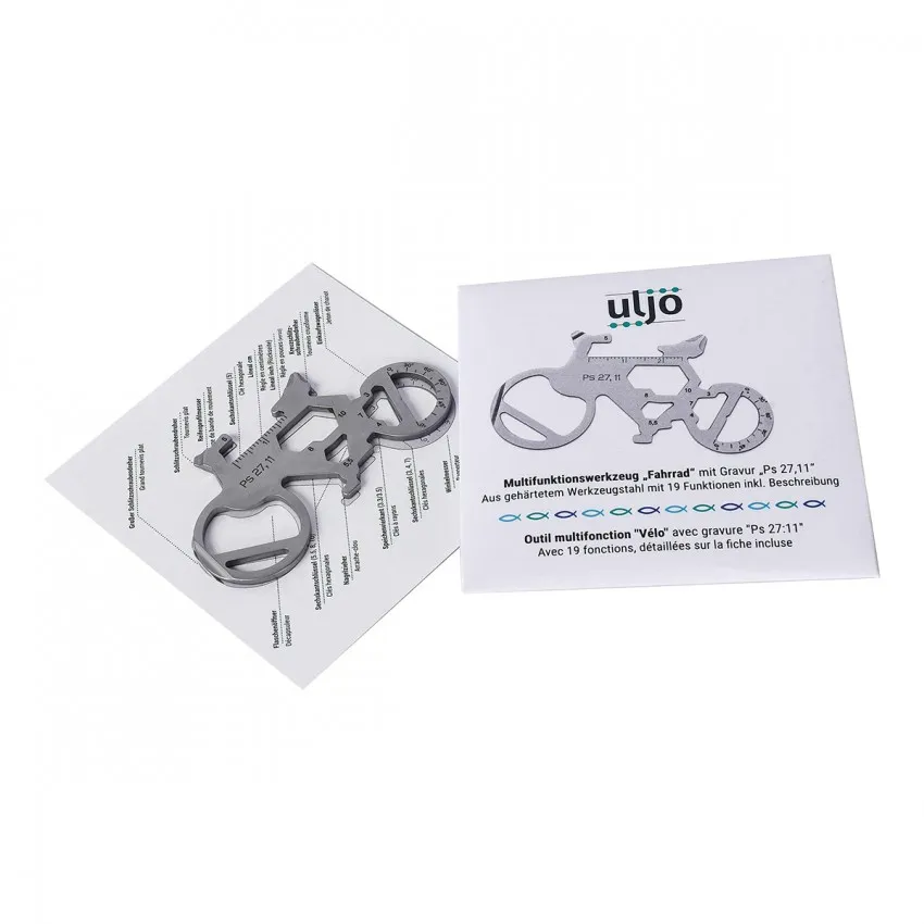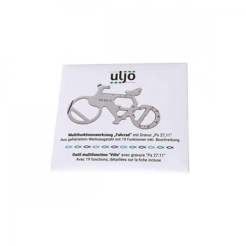 Outil multifonction de poche en forme de vélo avec 19 fonctions, gravé avec le Psaume 27,11.